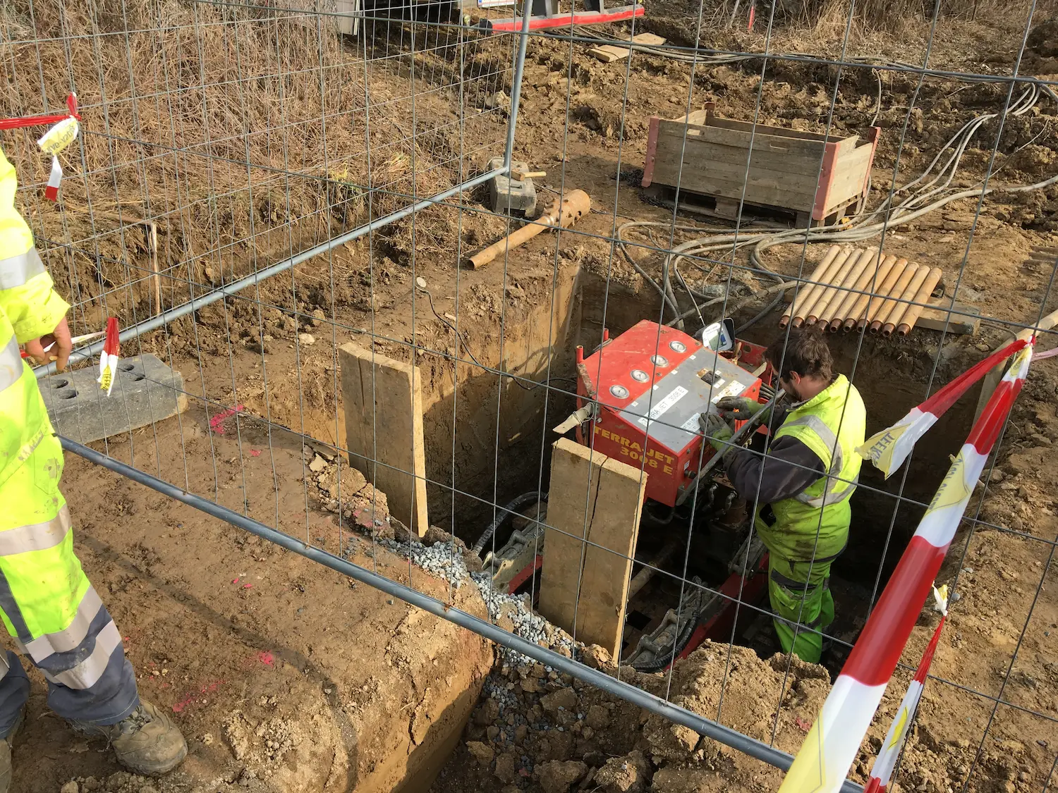 Hierbei wird eine Start- und Zielgrube in gewünschter Tiefe mittels Bagger ausgehoben. Die Maschine wird darin installiert und die Bohrung im gewünschten Durchmesser durchgeführt.